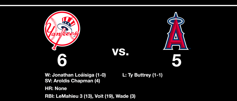 Wade ignited a two-out rally with his single and subsequent stolen base off Angels righty Ty Buttrey. Four pitches later, DJ LeMahieu came through with an RBI single to right that gave the Yankees their first and only lead of the evening. Luckily for the Yankees, it was the only lead they needed to put No. 14 in the win column.
